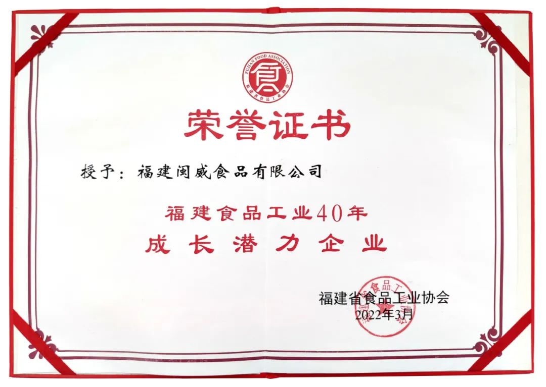 5月27日,福建省食品工业协会于成立40周年之际举办系列评选表彰活动, 福建闽威食品有限公司在此次评选中,荣膺“成长潜力企业”奖。