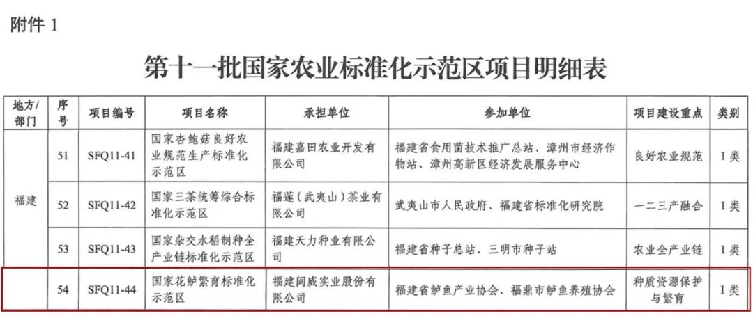 12月30日,国家标准化管理委员会发布第十一批国家农业标准化示范区名单,福建闽威实业股份有限公司“国家花鲈繁育标准化示范区”榜上有名。